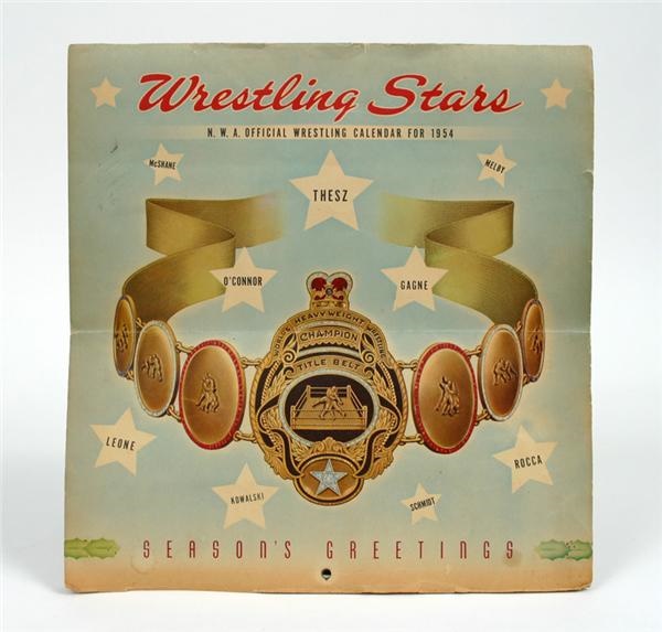 11.5"x12" calander includes six full page color illustrations by artist Vaughan Bass of early wrestling stars such as Baron Leone, Tarzan Kowalski, Argetina Rocca, and Pat O'Connor. Single left to right crease, overall VG-EX.