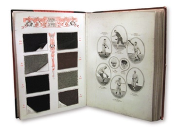 Enormous hardcover book is crammed with fabric swatches and wonderful lithographs of gentleman in the fashions of the day. But best are the six pages of photos of the best players in the Major Leagues, including such notables as Mathewson, Marquard, Cobb, Speaker, Bender, Wood and more. Foxing and moderate wear to the edges and binding are the only defects. Supreme rarity derives from the impressive Barry Halper collection.