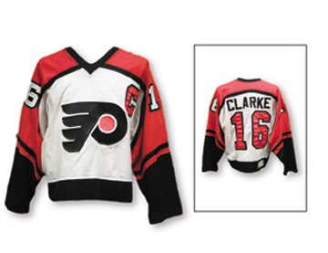 Bob Clarke captured more than his share of the spotlight as a player and continues to do so today at the helm of the Flyers franchise. This home white H.S.I. mesh "shortie" was worn by Flyers' fan favorite Bobby Clarke during the 1981-82 playoffs. "CLARKE" nameplate above the number "16" on the back with the captain's "C" on the left breast. The jersey features a heavy-duty fight strap, sewn H.S.I logo on the tail and a size "50" fly tag in the collar. Light use, as is to be expected from a playoff set.