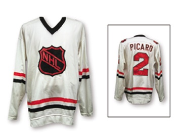 In lieu of the annual All Star Game, the stars of the NHL were pitted against those of the Soviet Union in the 1979 NHL Challenge Cup series held over three games at Madsion Square Garden. Although Capitals star Robert Picard appears in the game program and the team photo for the series, he is not listed as playing in any games. This white uniform has Picard's name and number "2" on the back, embroidered NHL shields on the shoulders and another larger shield on the chest. A Cosby tag with a code in marker is sewn into the collar. A truly rare jersey.