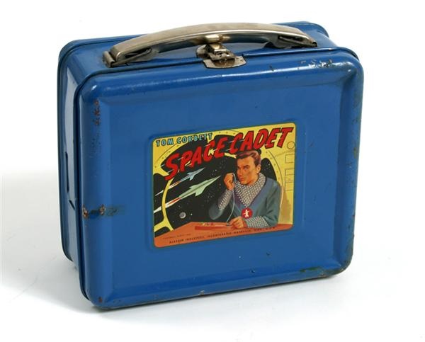 7x8x4" deep metal box features full color illustration on front. Made by Aladdin © 1952 Rockhill Radio. Some paint splattering to lower left corner, surface scratches on front and back, small trace of surface oxidation on interior. Still displays about Fine.