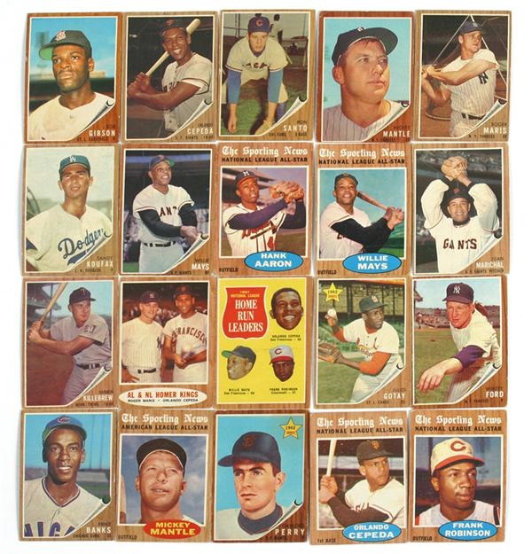 Twenty cards highlighted by Maris-even wear to corners (EX), Mantle-rounded corners (VG-EX), Santo-corner wear, oc (EX), Cepeda-corner crease, corner wear (VG-EX), Gibson-oc (EX), Koufax-oc, corner wear (VG-EX), Mays- corner and edge wear (VG-EX), Aaron NLAS- corner wear (EX), and that's not even the half of it!