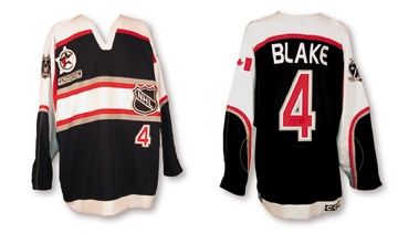 Norris trophy recipient and LA Kings star blueliner Rob Blake donned this stylistic sweater during the 2000 NHL All Star Game in Toronto. Blue and white uniform features four commemorative patches including the Canadian flag, the 2000 AS patch, the NHL 2000 patch and the team logo of the Los Angeles Kings. "BLAKE" runs across a plate above the number " 4." A smaller number is sewn onto the below the NHL shield. The tail has been embroidered with the CCM, NHL and NHLPA logos. Rob has boldly signed his name across the back number of this size 56 uniform. A NHL inventory tag has been sewn into the fight strap and an official LOA on NHL letterhead accompanies the lot.
