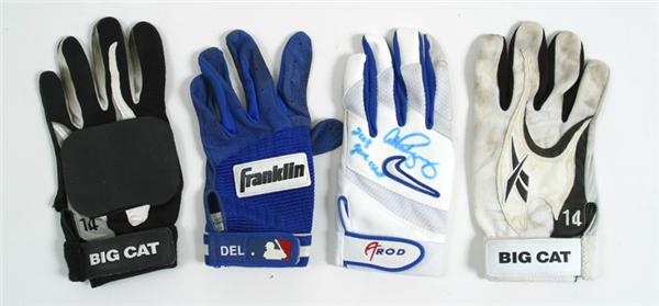 Included are 1) 2003 Alex Rodriguez-autographed and inscribed white Nike glove (left) with number "3" patch on inner wrist, [size] XL, good use. 2) Carlos Delgado-royal blue Franklin glove (left) printed with "DEL" on wristband, [size] XL, great use. 3) Andres Galarraga-white Reebok glove (right) with "Big Cat" on wrist band and embroidered with his number "14", [size] XXL, great use. 4) Andres Galarraga-black Reebok glove (left) with "Big Cat" on wrist band and embroidered with his number "14", [size] XXL, great use.