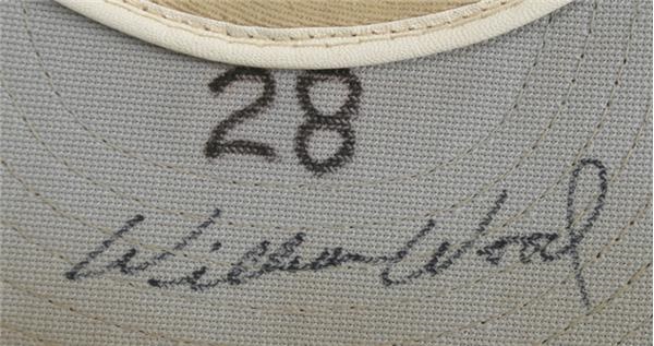 Navy New Era, [size] 7 1/8, is signed by the Sox knuckle-baller in black felt tip pen on the underside of the visor and written with his number "28" in black sharpie. Boasts phenomenal use throughout. Great early seventies gamer!