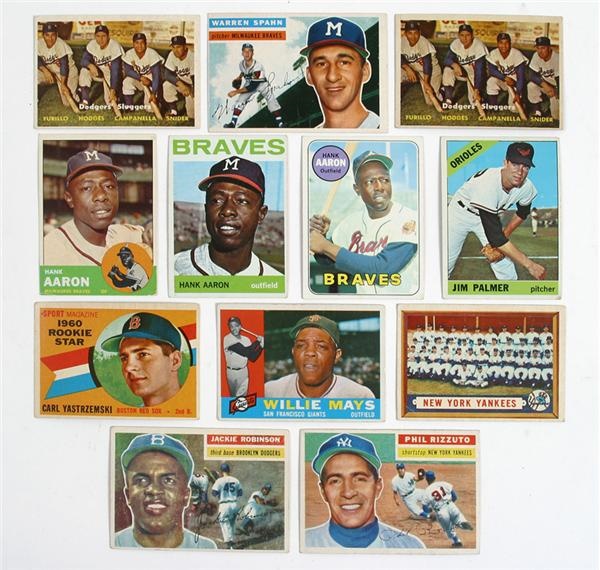 Highlights are 1) 1963 Topps Hank Aaron-creased corner (EX). 2) 1964 Topps Hank Aaron (EX+). 3) 1966 Topps Jim Palmer (rc)-creased corner (EX). 4) Sport Mag 1960 Rookie Star Carl Yastrzemski-even corner wear (EX+). 5) 1969 Topps Aaron-(EX+). 6 ) 1956 Topps Phil Rizzuto-edge wear (EX). 7) 1956 Topps Jackie Robinson-even corner wear (EX).