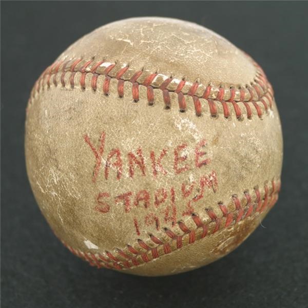In 1945 the New York Yankees honored our armed forces by having an active serviceman raise the American Flag before each game. This game-used baseball was from a game between the Yankees and Washington in which an active serviceman serving in the U.S. Navy raised the flag. He was seated behind the dugout and at the conclusion of the game, he was given a game-used ball by the team. "Yankee Stadium 1945" and "NY vs WASH" is printed in red ballpoint ink traced over faded black ink. on side panels. Ball comes with an LOA from the serviceman who we met in person (great gentleman).