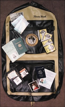The famed Pirates scout is best known for bringing a man named Clemente to the Majors. Four passports included in this lot are filled with stamps from Puerto Rico, Venezuela, the Dominican Republic, Panama, etc., showing that Haak made many trips back to the Latin American well after such a find. These passports are joined by various photos and postcards culled from Haak's many journeys south of the border, and contained in a monogrammed travel wallet. Best in the lot, however, is the black and yellow leather garment bag blessed with the Pirates logo and embroidered with Haak's name.