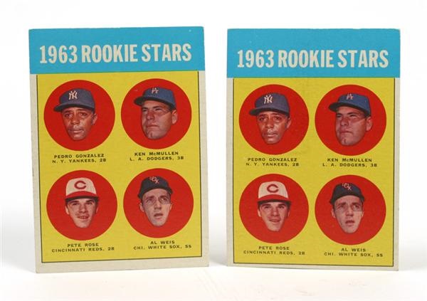 The first of this pair of Pete Rose rookie cards displays even corner wear and edge wear, grades as VG-EX. The second also shares the same kind of wear as well as paper loss throughout the reverse side, Good-VG.