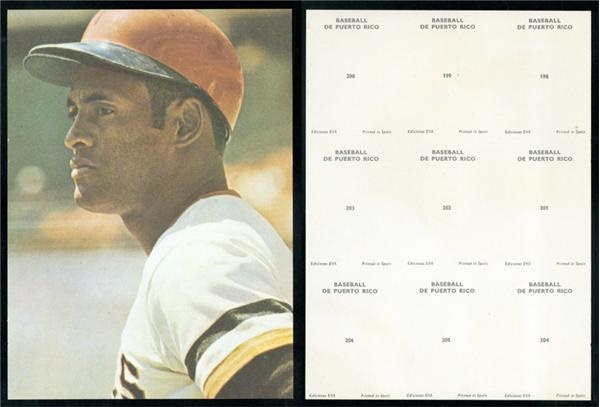 Uncut sheet intended for use with the 1972 "Baseball De Puerto Rico" card album (Cards #198-206). Fresh off the press appearance, NRMT. Measures 6.75"x8.75".