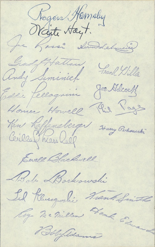 Autographed sheet (with 18 stamped signatures) is signed by Hall of Famers Rogers Hornsby (blue ink) and Waite Hoyt (black ink) from his broadcasting days that grades 9/10. Page is lightly toned from age and has top to bottom/left to right folds at center, EX+. Measures 5"x 8". Only the Hornsby and the Hoyt are genuine, the rest are stamped.