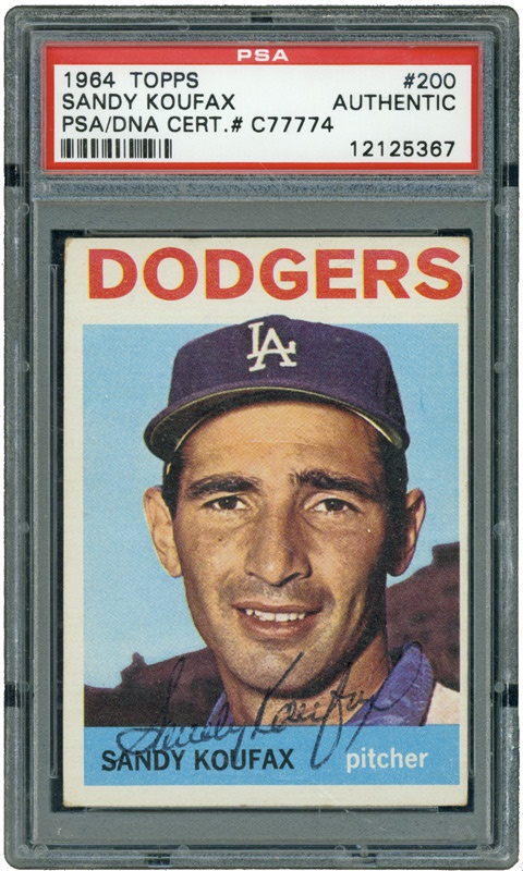 Sandy's autograph on the front of his 1964 Topps card (VG-EX) is written with perfect form and fluidity in dark black ink. An "8" out of possible "10" the signature has been certified as "Authentic" by PSA.