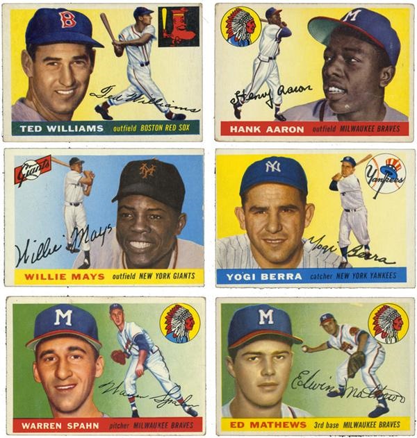 A nice little lot of 6 1955 Topps Hall of Famers included are, #'s 2 Williams VG-EX, 31 Sphan VG (light crease) 47 Aaron VG (light crease) 155 Mathews VG-EX, 194 Mays VG-EX (oc) 198 Berra EX (oc)