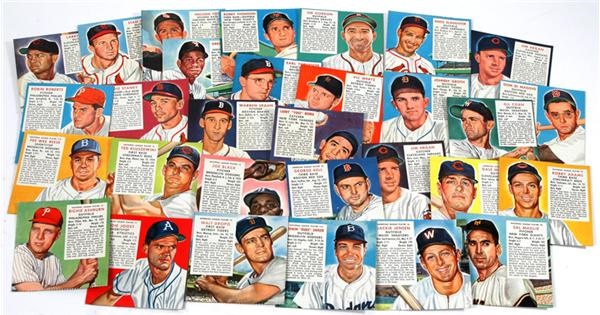Thirty card Redman collection includes eighteen cards from the 1952 issue. From 1952 are: Berra, Spahn, Doby, Stany, Roberts, Slaughter, and Musial. Twelve from 1953 with Snider, Joost, Ashburn, Kell, Kluszewski, and Reese. All of the tabs have been carefully removed. Overall the cards are VG-EX.