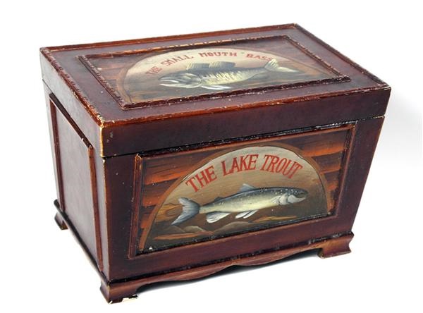 Handpainted wood box was made in the last several years is decorated with a two colorfully painted fish scenes. Text reads, "The Small Mouth Bass" on cover and "The Lake Trout" on front panel. EX. Great piece for any fresh water enthusiest.