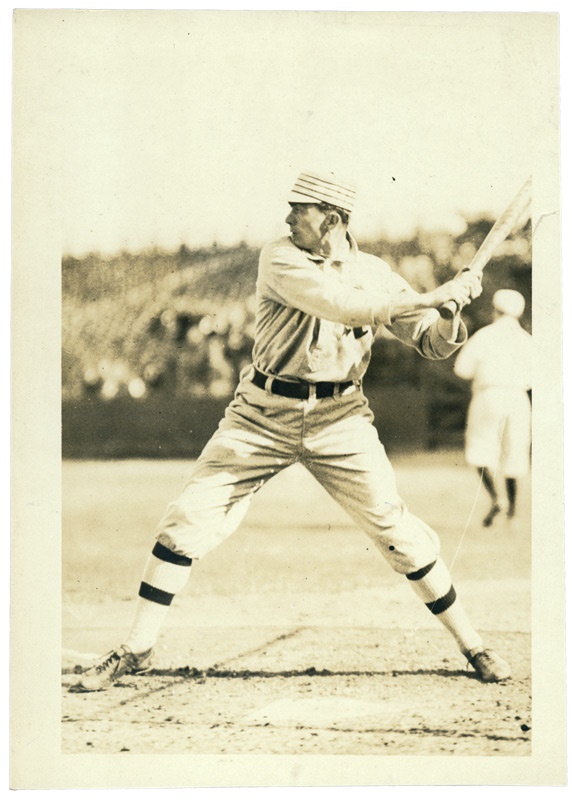 This spectacular photo, the definitive image of the Philadelphia phenom, displays superior contrast and quality. Quite possibly snapped by famed baseball photographer Charles Conlon this rare offering owns "Paul Thompson" stampings on the reverse, straight edges and nice corners, EX-MT.