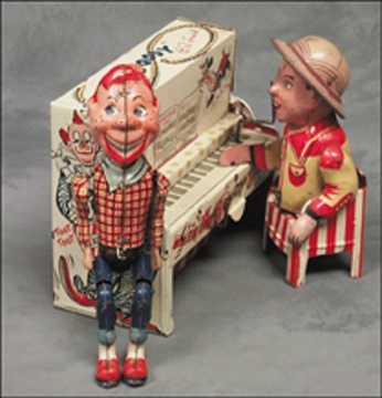 "It's Howdy Doody Time." Manufactured by the Unique Art Co. from New Jersey, this tin wind up toy is circa 1950's. Figures dance when wound up.