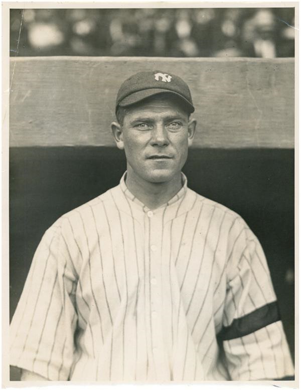 (6.5”x8.5”). The Yankee reliever is captured here just outside the Yankee dugout wearing a black armband over his pinstripes in memory of former Yankee Lefty Davis who passed away just befor the start of the season. Top left corner crease and pencil notations on the reverse, EX-EX+.