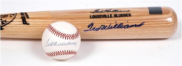 The perfect lot for any fan of Ted Williams. Included are the following items one Ted Williams official American League signed baseball signed in blue ball point pen, complete with PSA/DNA letter of authentication. Additionally, included is a Ted Williams signed bat with a Upper Deck Green Diamond hologram and COA. Considering Williams had an exclusive contract with Upper Deck this is the best certificate one could have with a Williams piece.