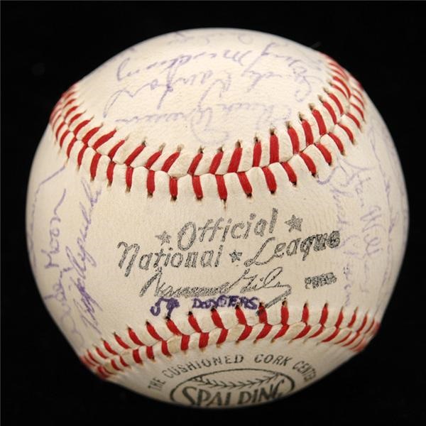 Podres, Craig, Reese, Alston, Koufax, Gilliam, Snider, Labine, Furillo, and Hodges have each signed this ONL (Giles) baseball in blue ink along with eighteen other Dodgers. Overall autographs grade 7/10, ball is EX-MT.