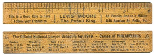 6" "Levis Moore" wooden ad ruler with steel straight edges printed with Philadelphia's schedule for the 1918 season on the reverse. Bold print on both front and back with only light pencil markings on front side, EX.