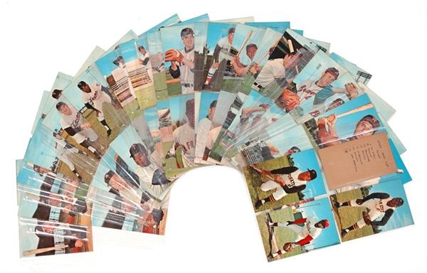 Each of the seventy eight 3.5"x5.5" cards has a brillant full color photo on front and player profile and facsimile signature on reverse. Complete set consists of five All-Stars and twelve players from Atlanta, Baltimore, Boston, Minnesota, Houston, and San Francisco. Included are Clemente, Staub, Carew, Killebrew, Perry, Mays and others. Light but even toning to the reverse and minor edge wear, overall EX.