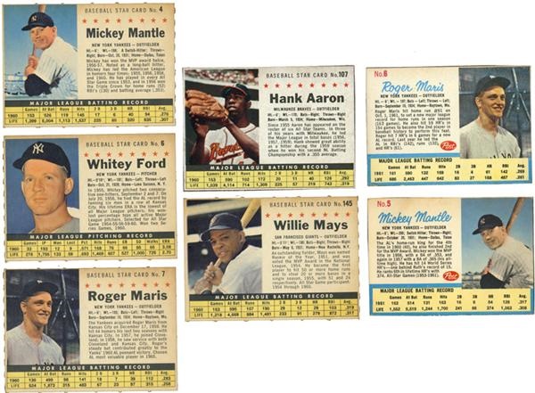 Large collection of blank-backed Post Cereal cards highlighted by 1961 # 4, Mantle, 6 Ford, 7 Maris 107 Aaron, 145 Mays, 1962 # 5 Mantle and a 6 Maris. Overall condition is VG.