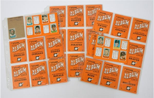 Affixed within each 2.5"x3.5" team stamp album are ten 1"x1.5" full color player stamps (240 total) alongside their respective stats. Mantle, Yaz,Tiant, Koosmam, and Clemente are just a few of the faces you'll find. Back covers have facsimile autographs. Minor edge wear, overall EX+.