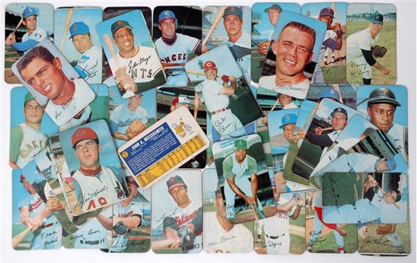 These oversize cards offer some of the best images on cards in the last 40 years. The large image encompasses the entire card. Excellent images of some of your favorite players from the late 60's and early 70's. Key cards include Stargell, Gibson, Aaron, Robinson, Yaz, and Rose. Overall the cards are NRMT or better and just 1 or 2 have creases.