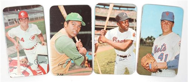 For the second year of production of this oversize issue of cards, topps expanded the set to 63. Offered here are some of the best images on cards in the last 40 years. The large image encompasses the entire card. Excellent images of some of your favorite players from the late 60's and early 70's. Key cards include Aaron, Jackson, Seaver and Rose. Overall the cards are NRMT or better and just 1 or 2 have creases.