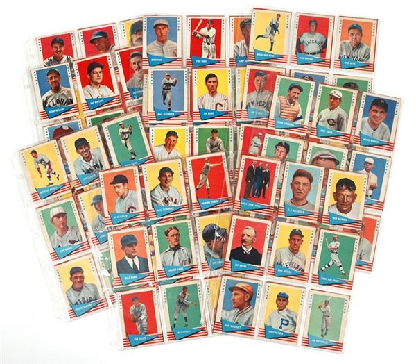 Fleer followed the success of their 1960 Baseball Greats by issuing a similar set in 1961. For this issue Fleer added more cards and improved the graphics of the product. Practically every card is EX-MT or better with many examples grading NRMT or NM-MT. Key cards include #'s 75 Ruth EX-MT+, 14 Cobb NRMT, 31 Gehrig NRMT, 120 Lajoie NRMT. Remember to take a look at the 1960 Fleer Baseball Greats set also in this auction