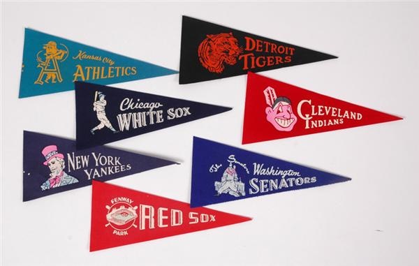 Seven 9" wool felt pennants from the mid-sixties include the K.C. Athletics, Washington Senators, Indians, Tigers, Red Sox, White Sox, and Yankees. All have maintained their bold color with screenings that appear fresh and 100% intact, overall condition is EX-MT.