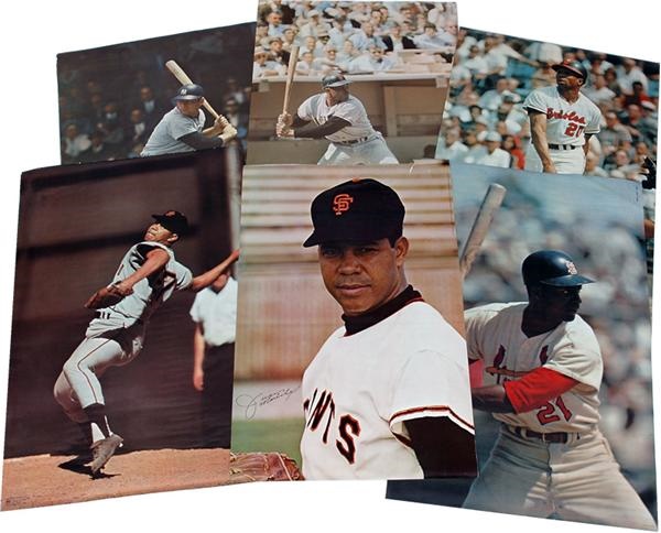 Seven 24"x36" baseball posters from SI include: Ernie Banks, Bob Gibson, Mickey Mantle, Juan Marichal, Curt Flood, Frank Robinson (signed), Willie Mays. The last is a 22"x34" Juan Marichal All-Star Sport specimen. All show wear to edges and creasing throughout, overall VG.