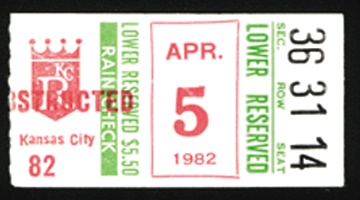 You've seen plenty of tickets from number 2,131, but we bet you don't have this one. It's amazing that this stub from an April 5th, 1982 game against the K.C. Royals survived to reveal its tremendous significance. Fans of the Iron Man have no choice but to go for this one. VG-EX.