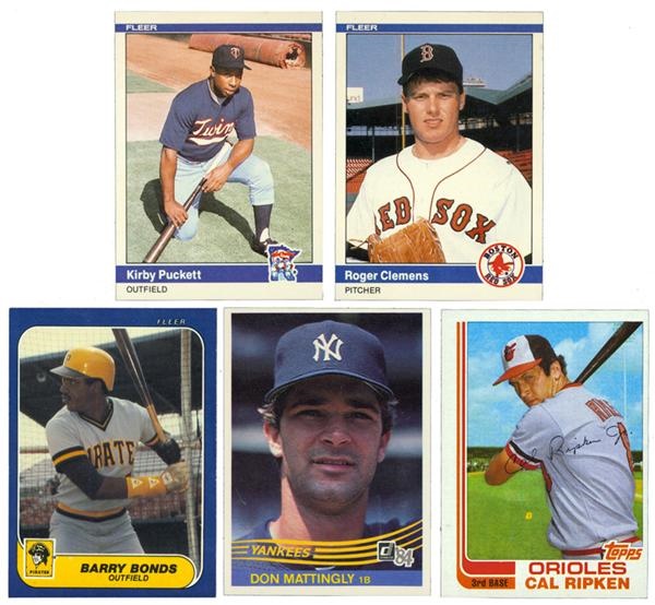 Rookie cards include: Bonds ('86 Fleer), two Mattingly's ('84 Donruss and '84 Fleer), Ripken ('82 Topps), Puckett ('84 Fleer), and Clemens ('84 Fleer.) Lot also has Reds team cards, Action Packed cards with Jeter and A-Rod, and much, much, more. Overall EX to EX-MT.