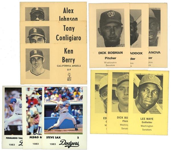 1983 Dodgers team set with Sax, Guerrero, Valenzuela, and Lasorda. VG. Jack In The Box California Angels team set with "Lefty" Phillips, Clyde Wright, Jim Spencer, Jim Fregosi, and Tony Conligiaro.. VG. D.C. Office of Traffic Washington Senators team set (2) with Wert, Howard, McCraw, Bosman, Stroud, and Maye. VG-EX.
