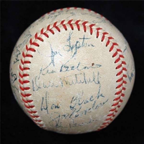 The ball contains twenty seven(27) blue ink signatures include Boudreau (sweet spot), Feller, Lemon, Bearden, Robinson, Gordon, Keltner, Tucker, Peck, Murray, Clark, and Hegan. Overall autographs grade as 7/10 while the ball itself owns a light even tone, all stampings have faded, EX.