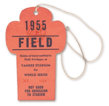 Rare pass states that "Holder of ticket entitled to Field Privileges of Yankee Stadium for World Series." Top has Yankee logo and "1955 Field." NRMT.