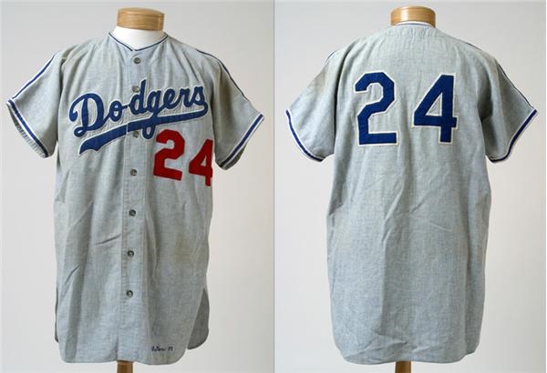 While baseball was switching to doubleknits, the 1971 Dodgers clung to their storied past with gray flannel on the road. Manager Walt Alston's game-worn jersey boasts the sweat stains around the collar and arm pits of a taciturn man who roiled inside. Imagine having Dick Allen on your team and losing the West Division by a game. Laundry-shrunken letters and numbers, and slight discolorations indicate heavy use. That season's uniform does not feature names on the back, but boasts simple adornments that still look fabulous: the blue and white pinstriping around the collar and piping down the shoulders; the elegant Dodgers script sweeping across the chest and Alston's No. 24 in red felt underneath. But the best touch of all is "Alston 71" embroidered in blue above the hem as if his mother did it.