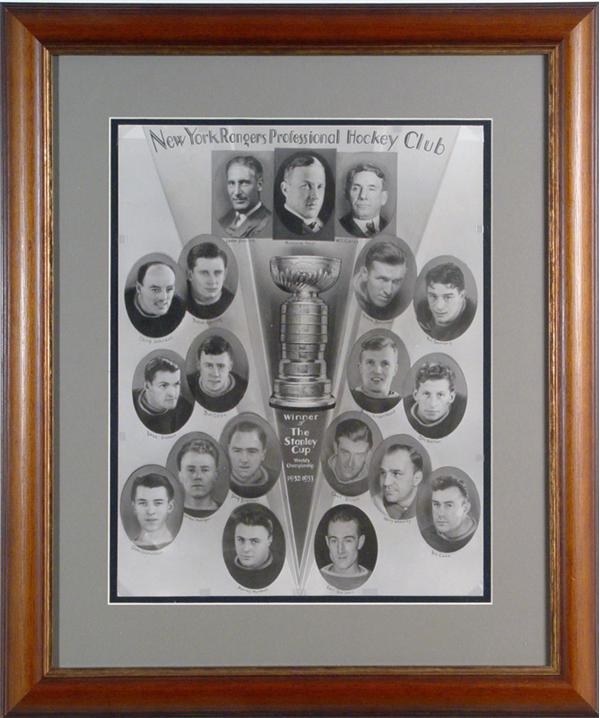 Important presentation photograph picturing the victorious New York Rangers of 1932-33, whose achievement would not be repeated in the Big Apple for over a half a century. Those players who appear in the portrait surrounding the image of the Stanley Cup -- and who were presented with the photo -- include Ching Johnson, Babe Siebert, Bun Cook, Earl Seibert, Bill Cook, Frank Boucher and coach Lester Patrick. This vintage professional print on glossy photo stock measures 13x16" and has been archivally matted and framed significantly larger. This is the first we have seen in this size.