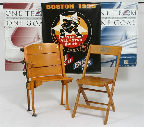 The guts of the old snakepit on Causeway Street may be gone but its spirit lives on in hallowed items salvaged before the Garden was demolished. Folding chair with a gold plate reads "Boston Garden 1946-1995 Floor Seats, Boston Celtics/Special Events". Floor mounted seat has stenciled number "11." Both in splendid condition, the former with smoothly shellacked wood, the latter with minimal nicks, tarnish and paint loss. Also 3 banners signed by beloved Bruins defenseman Ray Bourque, one 30 x 40" from the '96 NHL All-Star Game (played at the Fleet Center) signed "Ray Bourque, MVP '96", and two 24 x 35" "One Team, One Goal" Avalanche banners, one blue, one maroon, from the 2001 playoffs when Bourque was with the team and won the Cup. All 3 Bourque signatures and the banners are NRMT.