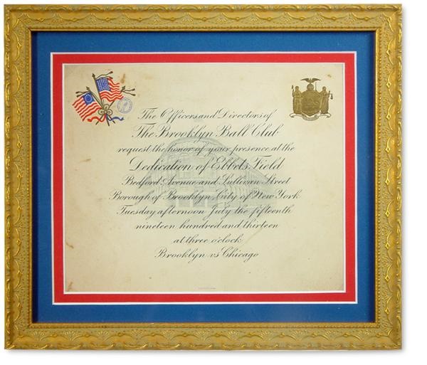 No one could have foreseen the likes of Hilda Chester, the Sym-phony and 42 years of unrequited pining for a championship when these formal invitations to the 1913 Dedication of Ebbets Field were sent out by the Dodger front office. In order to get the park built, owner Charles Ebbets had to sell half the team to Ed and Steve McKeever, but it was a small sacrifice in exchange for the spanking new 30,000 baseball palace bearing his name. Emanates from the Nap Rucker estate. Elegantly printed text reads, "The Officers and Directors of The Brooklyn Ball Club request the honor of your presence at the Dedication of Ebbets Field - Bedford Avenue and Sullivan Street, Borough of Brooklyn, City of New York, Tuesday afternoon July the fifteenth, nineteen hundred and thirteen at three o’clock - Brooklyn vs. Chicago." Wonderful hand-colored graphics of American flags in the corner and raised golden seal at top right. Double matted and framed to 8x10". Invitation certificate is in Excellent condition.