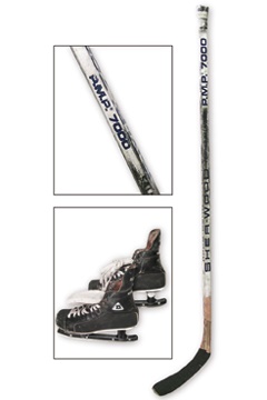 The tools of the game, as used by the relentless Hall-of-Fame blueliner Borje Salming during his days with the Leafs. The stick is a Sherwood PMP, factory stamped "SALMING" and "21" with an additional"21" in marker. Heavy black tape covers the knob and blade and the factory pattern code and date stamp appears on the back of the shaft. A tag taped to the stick reads "April 6, 1986" referring to the game the stick was used in. Signed in blue ballpoint on the shaft. The skates are Daoust 301 National's with black plastic blade holders. Custom factory coding inside each boot dates the skates to 1979. The number "21" is marked in blue on bottom of each well-worn boot. Both items obtained from Leafs trainer Guy Kinnear in the 1980's as the LOA explains.