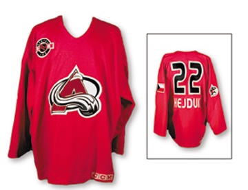 The performance of Colorado's young Czech prodigy Milan Hejduk earned him a spot on the World roster at the 2000 NHL All Star Game in Toronto. This is the brilliant red uniform worn by Milan at the sold-out All Star Practice at the Air Canada Center. Three commemorative patches adorn the jersey including the Czech flag, the 2000 AS patch and the NHL Center Ice logo. The Colorado Avalanche logo sits square on the chest and "HEJDUK" runs across a plate under his number " 22." The tail has been embroidered with the CCM, NHL and NHLPA logos. Milan has boldly signed his name between the back number of this size 56 uniform. A NHL inventory tag has been sewn into the fight strap. LOA included.