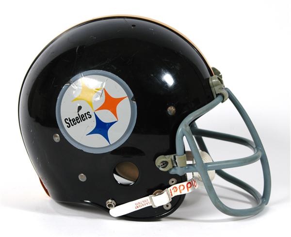 This brutally beautiful Steeler helmet worn by Franco Harris early in his HOF career is a rare treat for Francophiles. Hardcore Steeler buffs (is there any other kind?) will be able to idenfity all the earmarks of thhis vintage headgear. Such distinguishing characteristics are subtle, given that the team has worn basically the same helmet since 1962 when the 3-hypocycloid (sort of a triangle) Steelmark logo -- yellow for coal, orange for ore, blue for steel scrap -- was first used as part of a promotional campaign by the steel industry. One giveaway is that it's a suspension helmet, which endured from the '50s until the mid-70s. (Franco began in 1972.) Another is its gray facemask, which was changed to black in '76. (Some trivia: the Steelers are the only team to put their logo on only one side of their helmets.) Speaking of earmarks, there are those and all other head-area marks on the Riddell helmet, left by Franco's forays through and around the line of scrimmage, and the logo sticker is torn in 2 spots and gashed in others through the colors are still vivid. The gold adhesive strip running from front to back, where it splits Franco's taped-on number "32", begins about an inch from the front, leaving an earea where the Riddell nameplate used to be. Chin strap with "Riddell" in red is intact. Facemask also in good shape with a few light gashes. Interior padding is firm, with one padded strip having a "4" and another the size "7 1/2" stamped on. There are no numbers on the front of the helmet indicating that it was used by Franco during the Steeler's training camp. Helmet comes from former NBA player Moose Miller who obtained it during the 1970s. Great original helmet from the pit bull of those 4 Super Bowl-winning teams.
