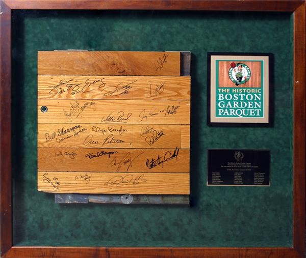 Every NBA All-Star Game MVP who ever played on the hallowed hardwood of the Boston Garden, either as a Celtic or an opponent, signed this 24 x 24" partition of parquet. Numbering 21 in all, among the names are some roundball royalty -- hometown heroes Bob Cousy, Bill Sharman & Tiny Archibald, Paul Arizin, Bob Petit, Julius Erving, Karl Malone, John Stockton, Oscar Robertson, Elgin Baylor, Rick Barry, Willis Reed, Walt Frazier, Dave Bing, Jerry Lucas, George Gervin, David Thompson, Ralph Sampson, Hal Greer, and Adrian Smith. Their NRMT signatures in black marker adorn the 24 x 24" square, the top slat of which is shorter than the rest leaving a slight gap. Parquet is mounted against a green marble-style background to the left of one plaque bearing the Celtic logo and "The Historic Boston Garden Parquet" and another explaining the distinction of the NBA All-Star Game MVPs who signed the parquet. Dazzling display is preserved under glass within a sturdy 43 x 48" mahogany frame with a small amount of surface chipping that can be easily repaired. Overall, piece is NRMT and another humbling piece of parquet "butter." With LOA from Celtics.
