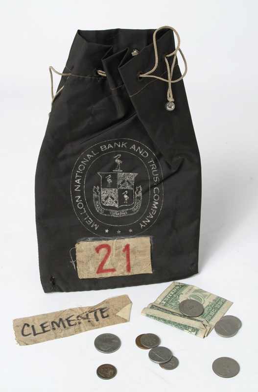 A wonderful item of Clemente arcana is this brown nylon money bag that Roberto kept in his locker at Three Rivers Stadium. Though one of the highest paid players of his era, he was just a bit early for the really big money to come, a fact perhaps underscored by the fact that the pouch contained a mere $2.02 in change when his possessions were cleaned out of his locker after his death, and which is still in it now. 6 x 10" drawstring bag has the Mellon National Bank & Trust Company logo on the front. Two adhesive labels have come off but have been retained, one reading "Clemente" in black and the other "21" in red. Bag VG+. From the Phil Dorsey collection.