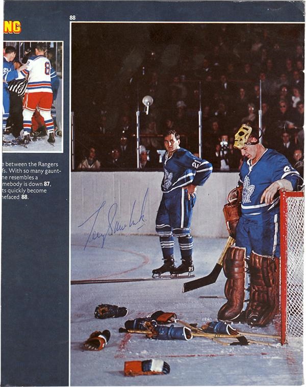 This pair of terrific magazine photos on opposite sides of the same page, which sum up the mixed emotions of being a goalie, were signed by two all-timers who between them endured those emotions for almost 40 years, Jacques Plante and Terry Sawchuk. Plante is bracing as a skater tries to bat down a puck, while an exhausted Sawchuk tries to take a breather, his mask slid up on his forehead, gloves and sticks from a brawl littering the ice in front of him, a teammate staring at him in pity nearby. Signatures in blue ink are clear and strong 9's. 8 x 10" page and pictures NRMT.