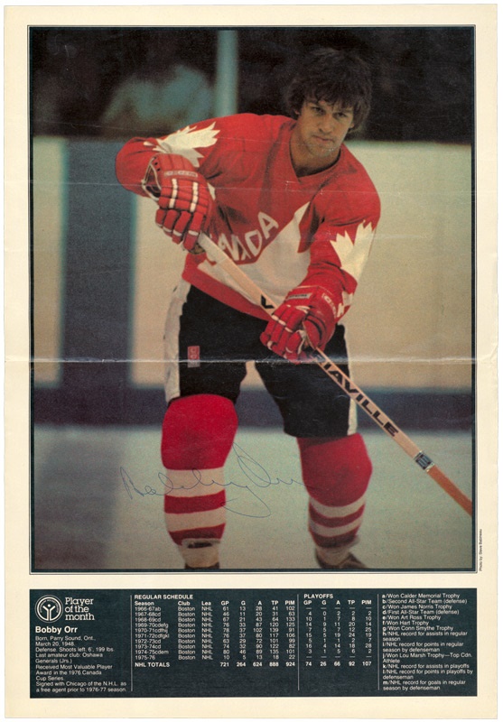 Inspiring collection of photos from Goal and Sport magazines, each signed by the greatest defenseman ever. Great double-truck centerfold shot of him in his Team Canada uniform from the victorious '76 Canada Cup series in which he was named Most Valuable Player, action shots from his glory days in a Bruin uniform, and a few from his last two seasons with the Blackhawks. Autographs in blue ink average EX-NRMT as do the pages, which also include autographed images of Phil Esposito (scoring a goal on his brother Tony) and Gerry Cheevers.
