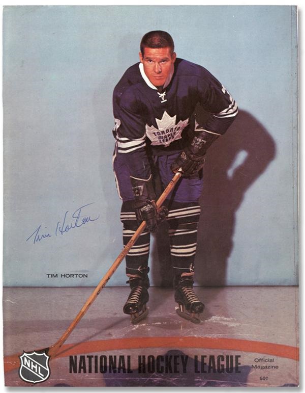 One of the toughest mugs in the NHL, Horton was a 7-time All-Star defenseman who played from 1952 to 1970 with the Maple Leafs, winning 4 Cups, and overall for 22 seasons before being killed in a tragic car accident in 1974. He was inducted into the HOF in '77. This marvelous full-page photo of him posed in his uniform from the NHL's official magazine/game program bears Horton's hard-to-find signature in blue ink, grading NRMT status, as does the 8 1/2 x 11" photo page.